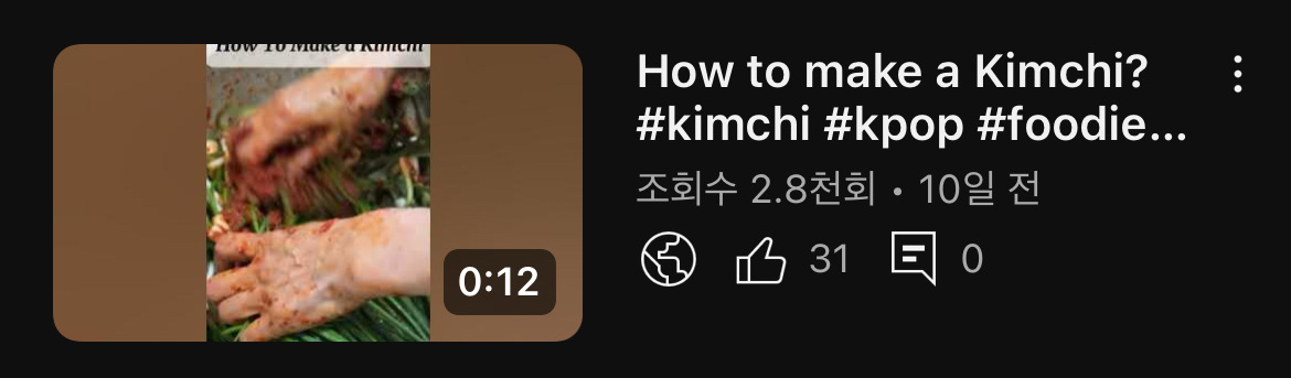 가장 많은 조회수! 엄마가 김치 만들 때 옆에서 살짝 찍어뒀었다. 근데 재미있는건 ‘파김치’ 는 조회수가 괜찮는데 ‘열무김치’ 는 조회수가 안나온다는 거다. 이게 왜 이럴까?