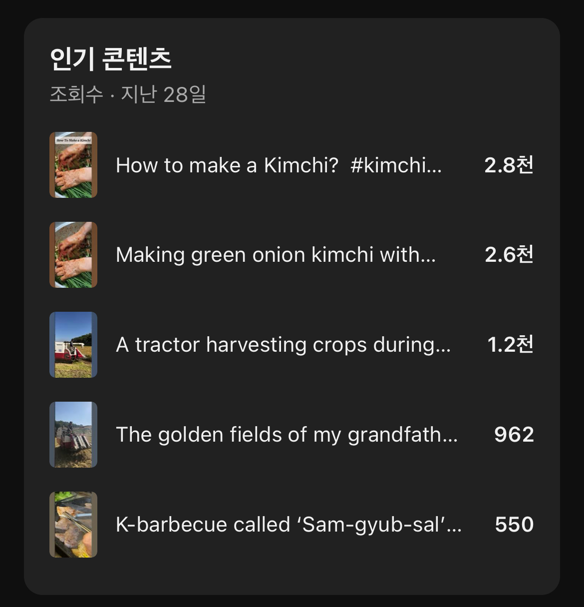제 컨텐츠의 인기 영상은 이렇네요.