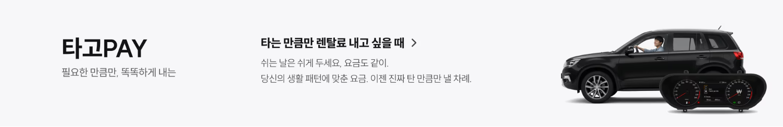 하지만 일반 장기렌터카는 연 1만 km 이상이 기본이다. 실제로는 절반도 못 타는데, 요금은 꽉 채워서 내는 구조다. 타고페이 플러스는 이 불합리를 정확히 파고든 상품이다.