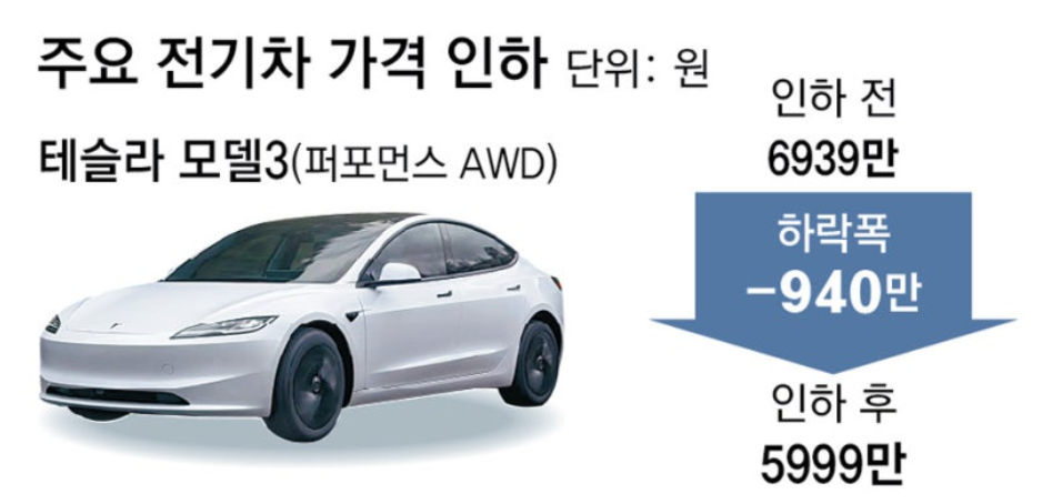 | 테슬라 모델3 | 약 940만 원 | 수입 전기 세단 가격 기준 붕괴 |