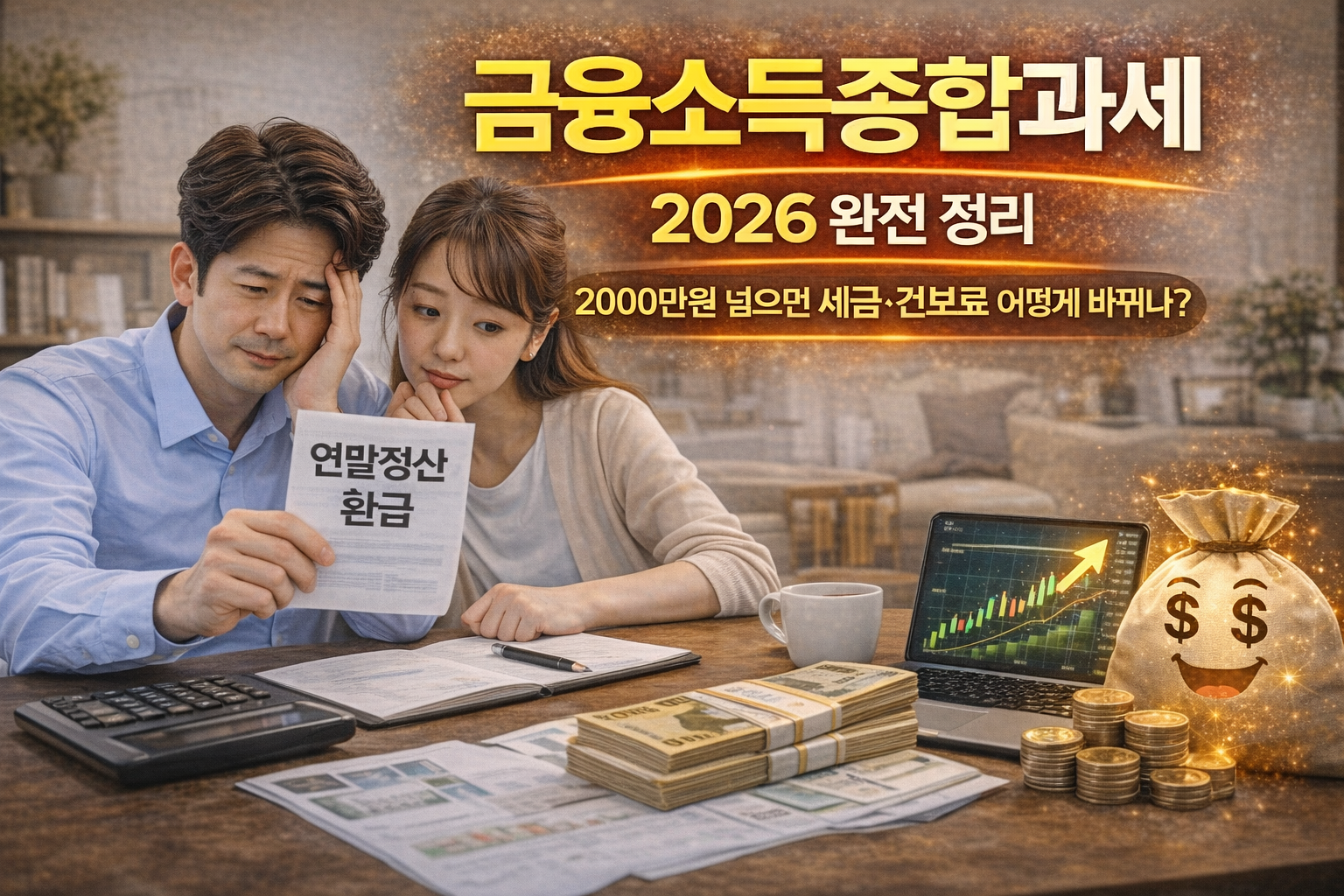 제가 배당주 투자를 시작하고 2년쯤 됐을 때였어요. 월 배당 ETF 몇 개에 은행 예금까지 합쳐서 분기 결산을 해보니 연간 금융소득이 1,800만원대가 나오더라고요. "어, 이러다가 2,000만원 넘겠는데?" 싶어서 처음으로 금융소득종합과세라는 걸 찾아봤습니다. 그 전까지는 은행에서 이자 줄 때 15.4% 세금 떼고 주니까, 그냥 세금은 자동으로 끝나는 거 아닌가 생각했거든요. 결론만 말하면, 2,000만원이 넘는 순간 그 안이한 구조가 완전히 달라집니다.